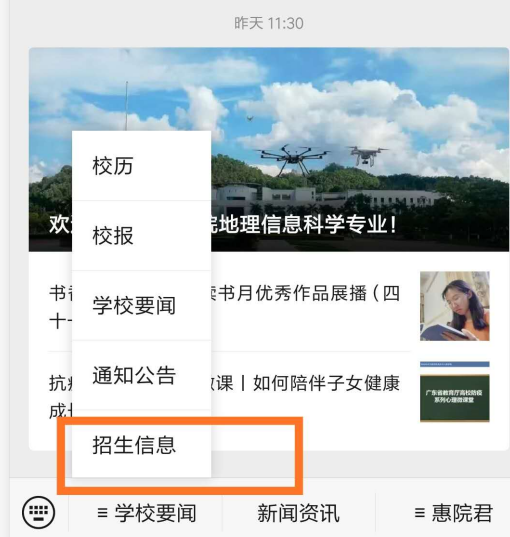 关注“今日惠院”微信公众号,选择“招生信息”菜单即可进入,进入之后点击下面的“在线咨询”栏目。